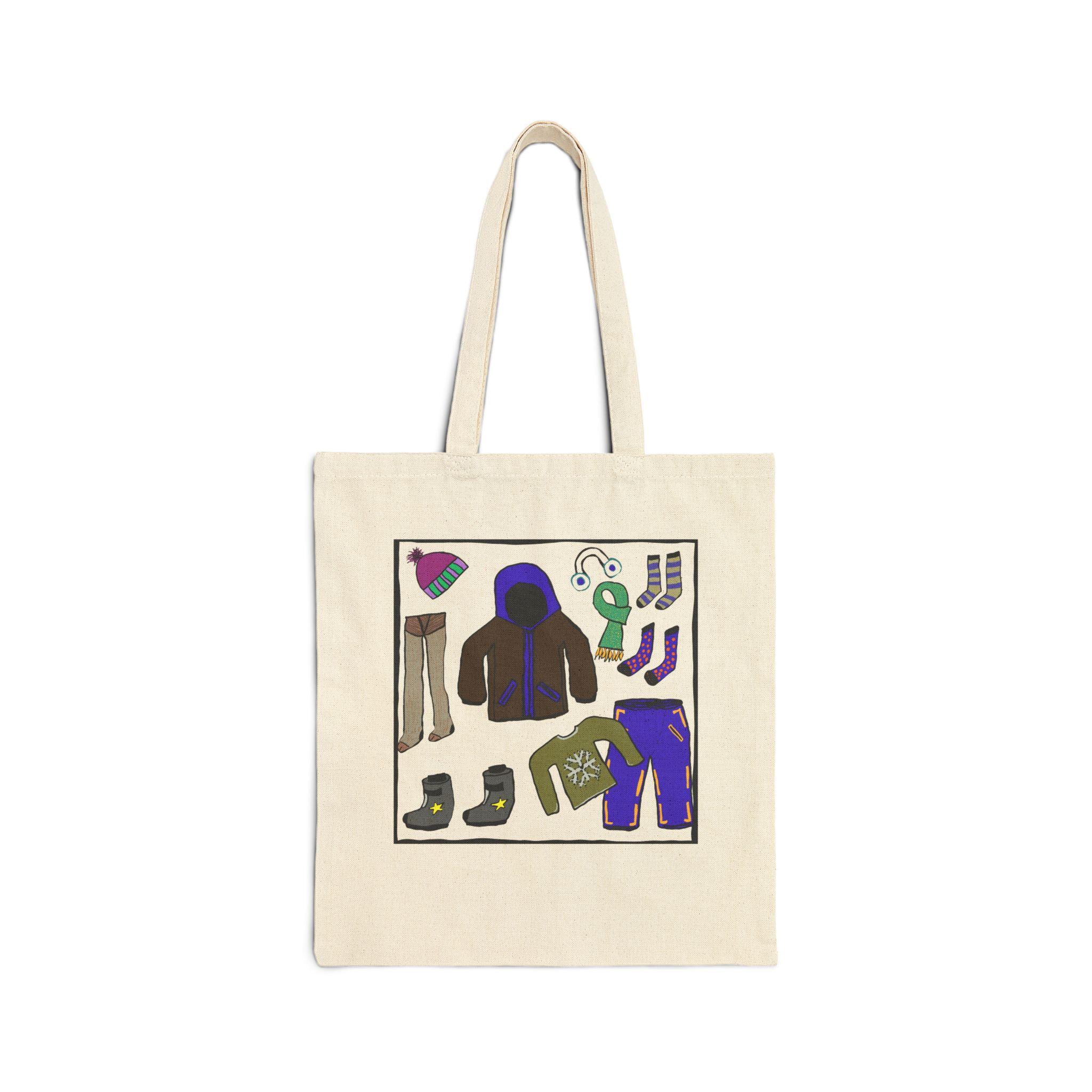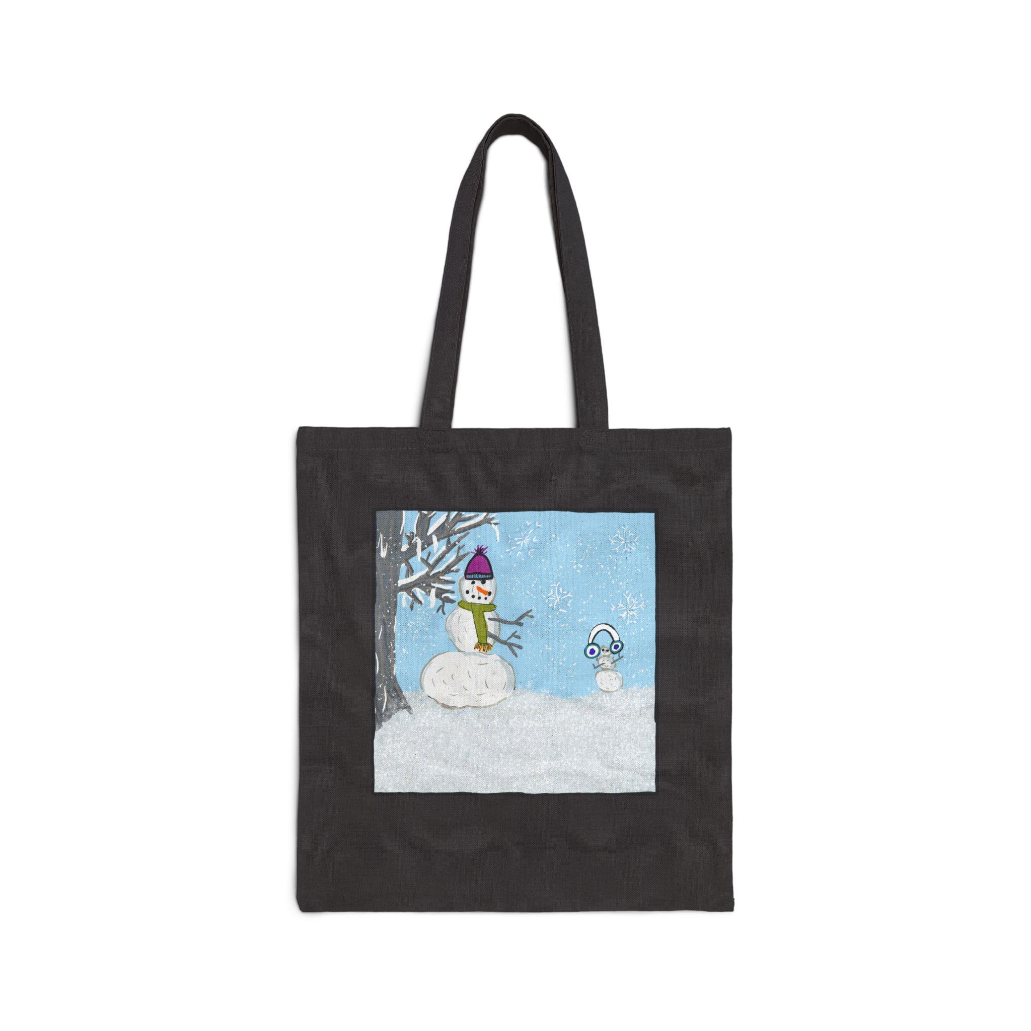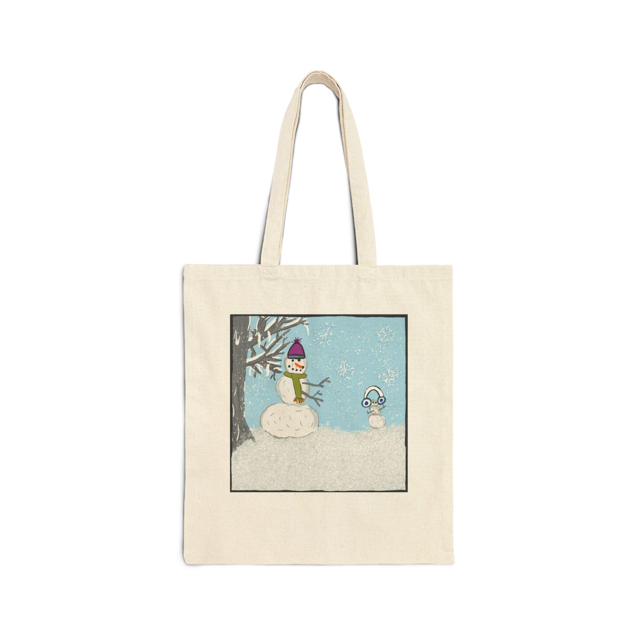 This cotton canvas tote brings cozy winter scenes into everyday carry. The heavy 12 oz canvas holds its shape while showcasing playful, hand-drawn artwork: one side features a gentle snowy vignette with a bundled snowperson beneath a bare tree, the other displays a collage of winter essentials — boots, mittens, a puffy jacket and hat — rendered in warm, saturated colors. It feels like a quiet morning walk to a neighborhood café or a stroll through a holiday market. The long, reinforced handles sit comfortably on the shoulder, and the flat, roomy body keeps books, groceries, or a knitting project neat and upright. Available in natural or black, this tote pairs useful durability with a small, personal touch of seasonal charm.