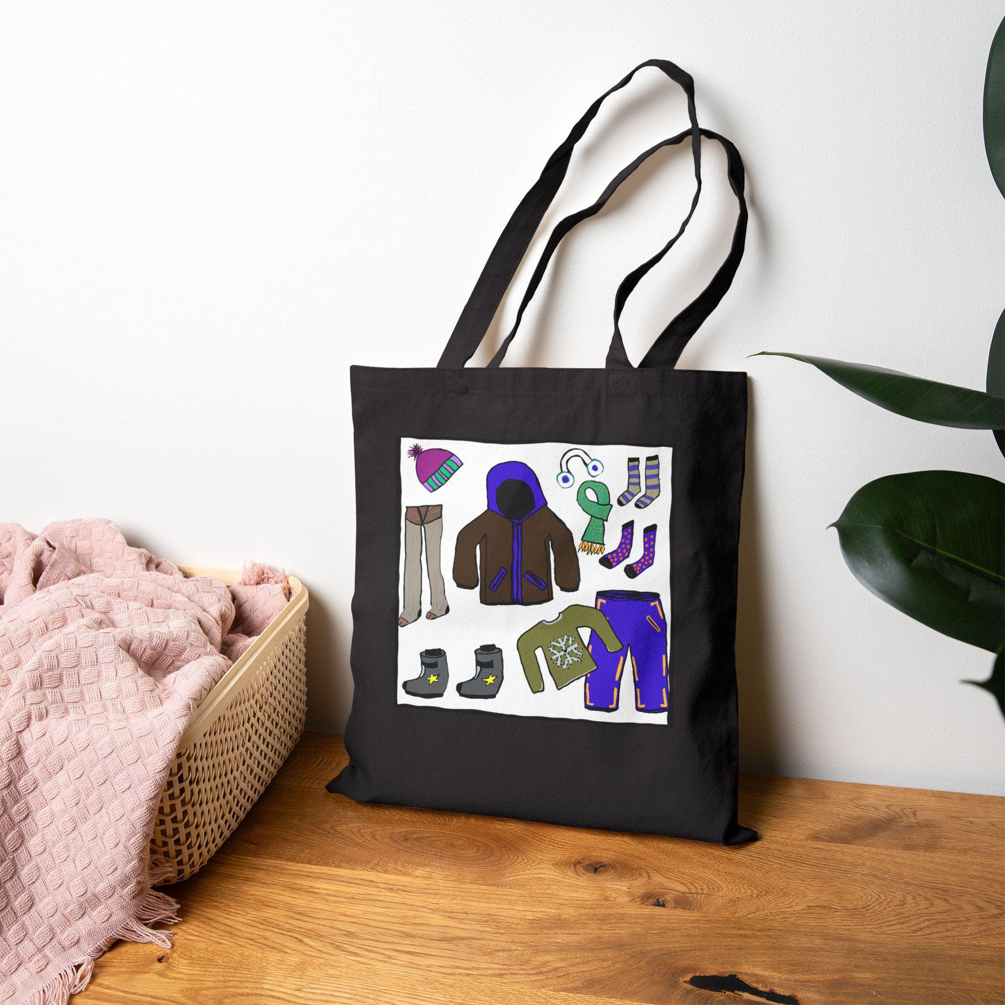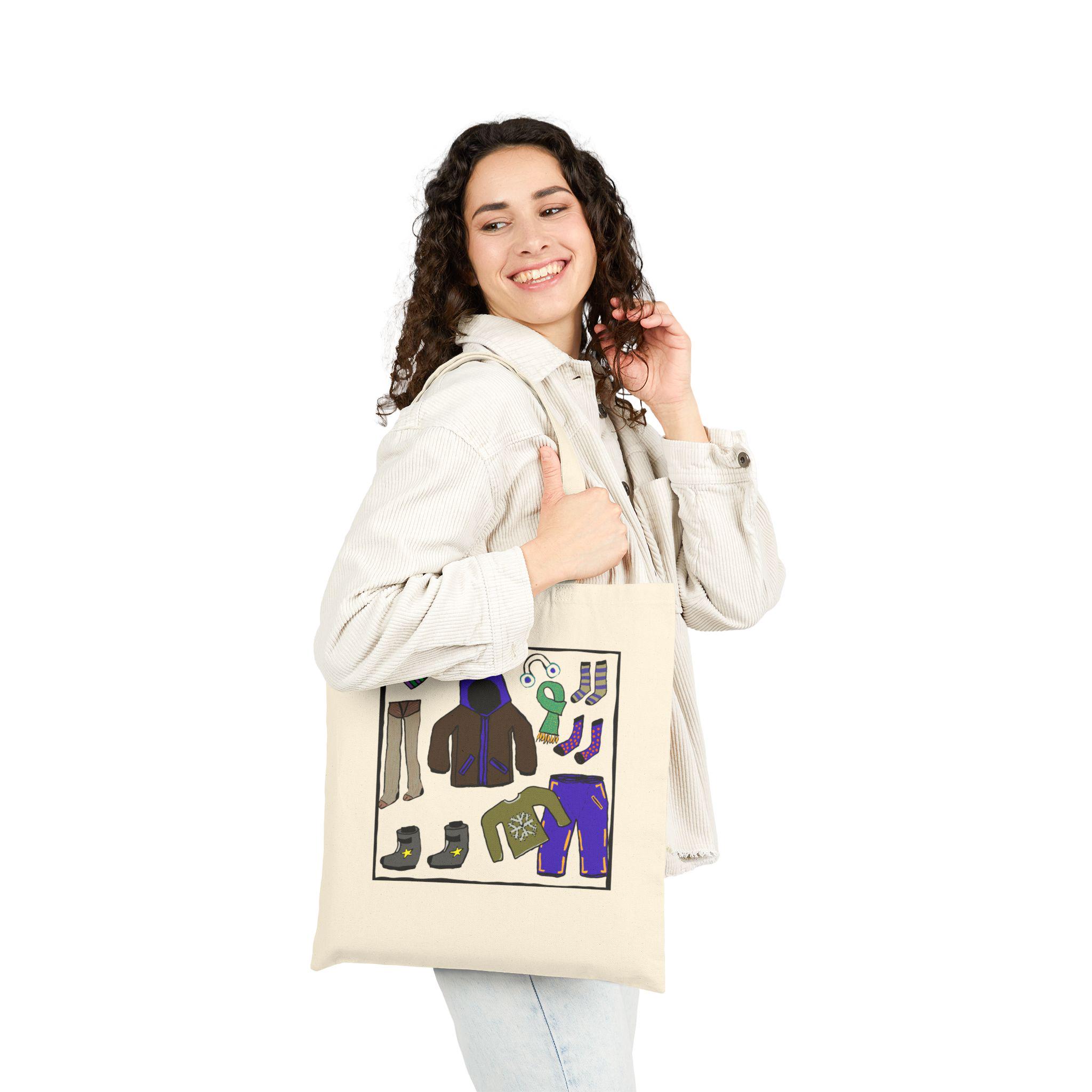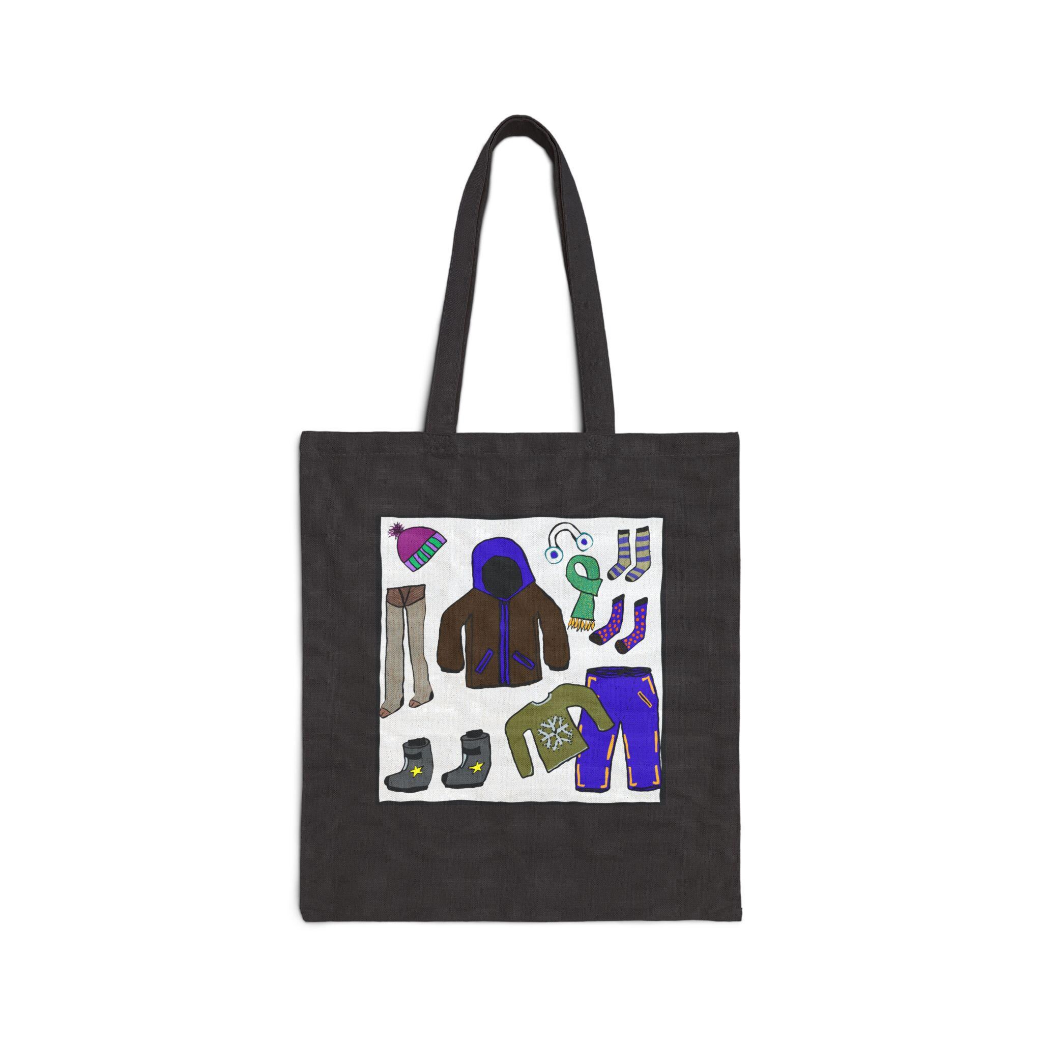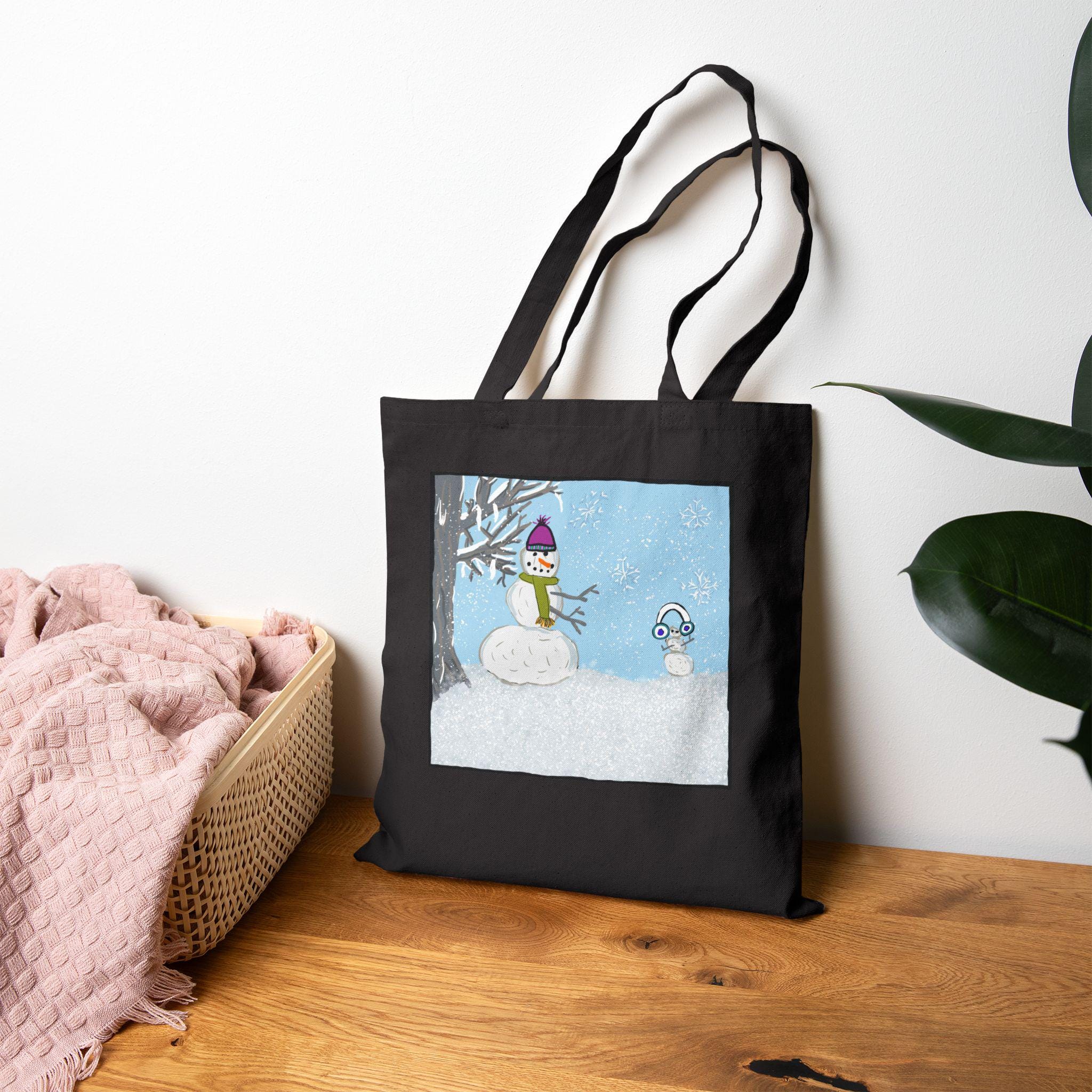 This cotton canvas tote brings cozy winter scenes into everyday carry. The heavy 12 oz canvas holds its shape while showcasing playful, hand-drawn artwork: one side features a gentle snowy vignette with a bundled snowperson beneath a bare tree, the other displays a collage of winter essentials — boots, mittens, a puffy jacket and hat — rendered in warm, saturated colors. It feels like a quiet morning walk to a neighborhood café or a stroll through a holiday market. The long, reinforced handles sit comfortably on the shoulder, and the flat, roomy body keeps books, groceries, or a knitting project neat and upright. Available in natural or black, this tote pairs useful durability with a small, personal touch of seasonal charm.