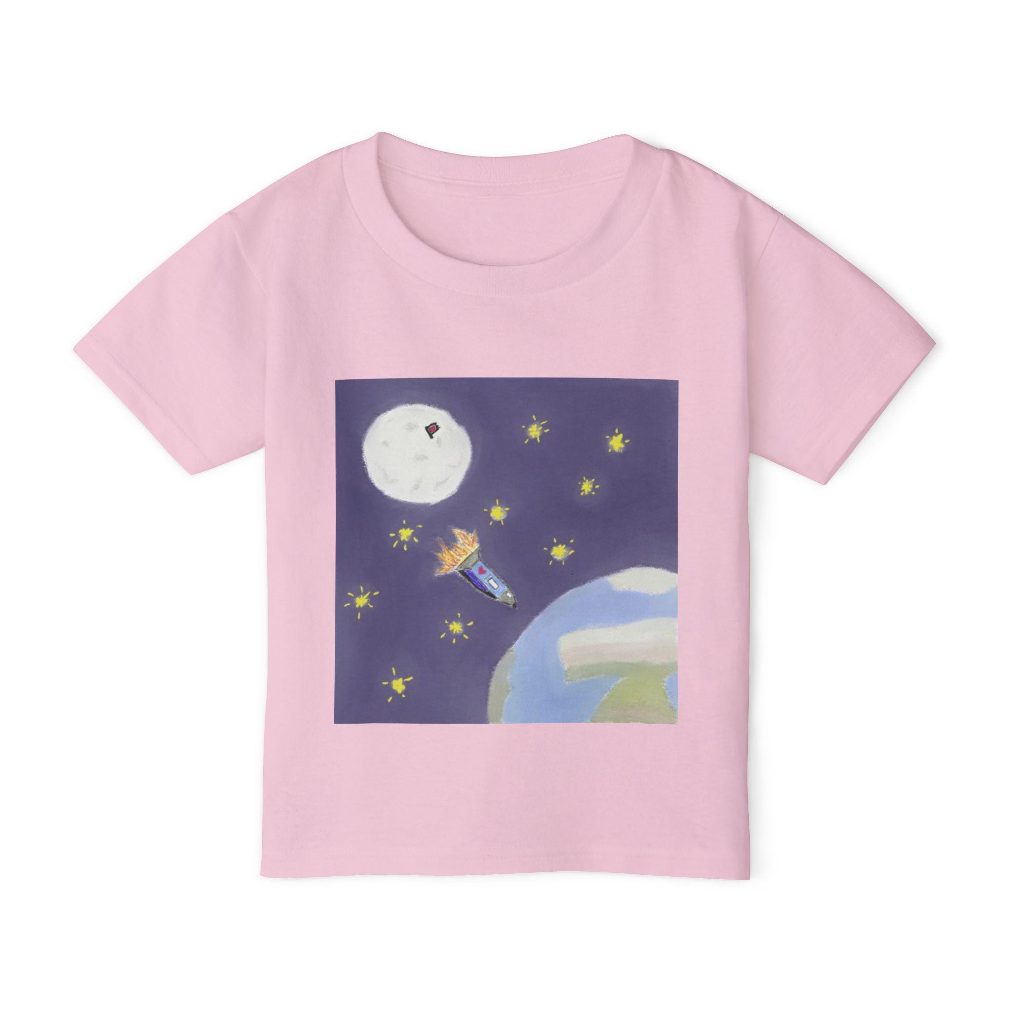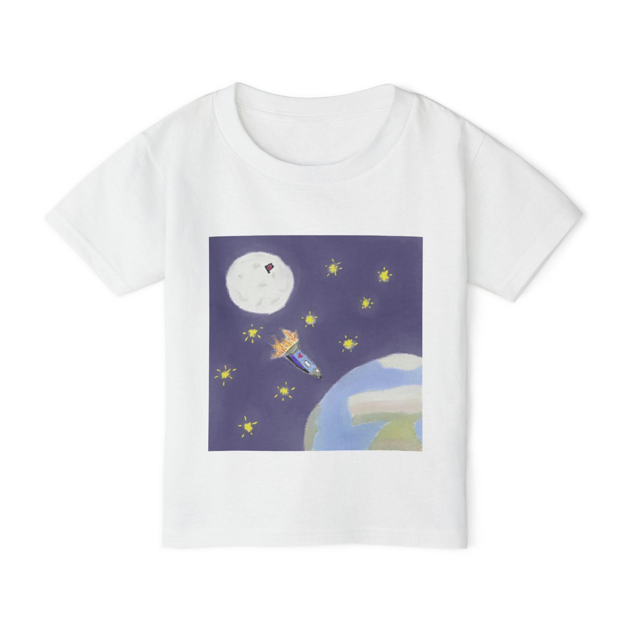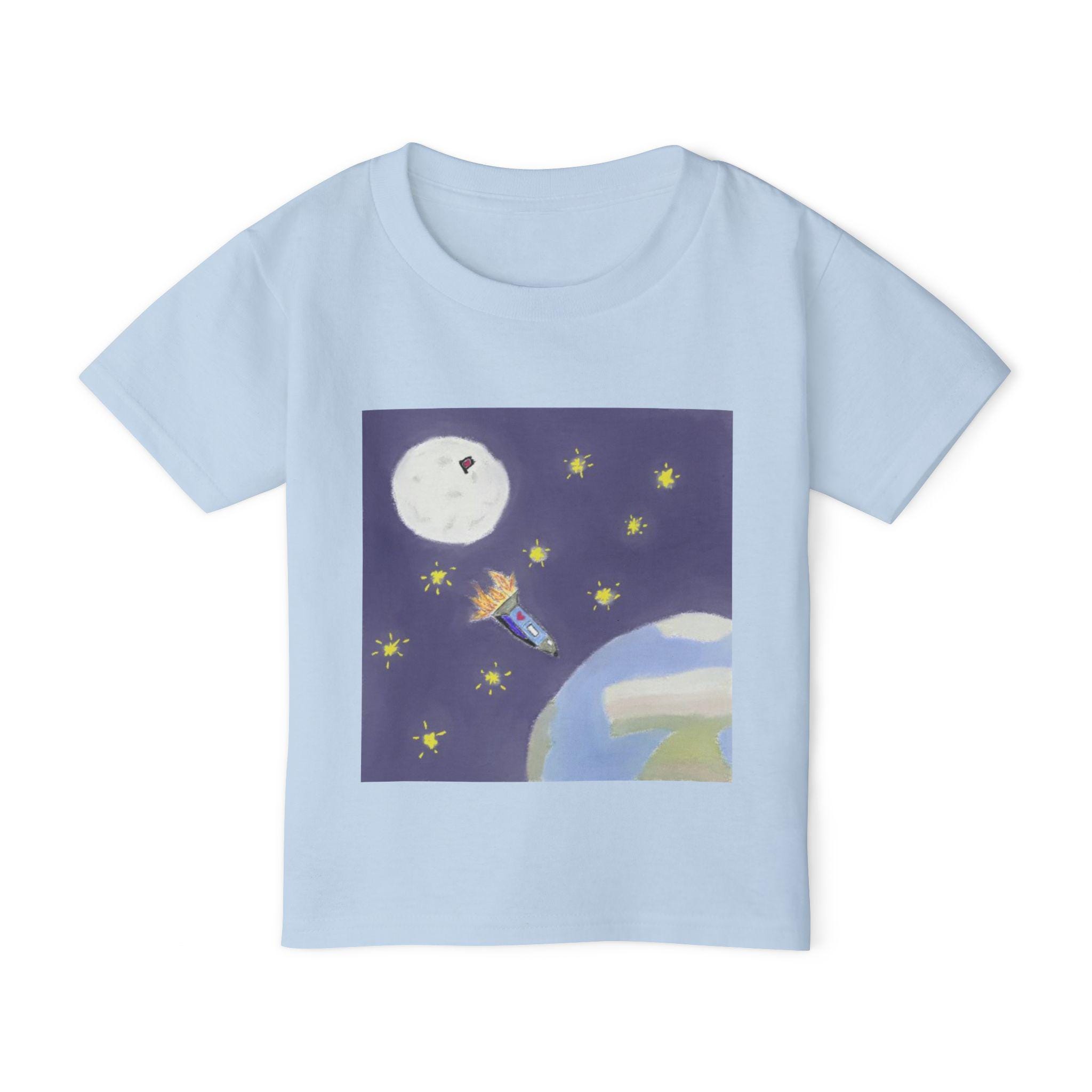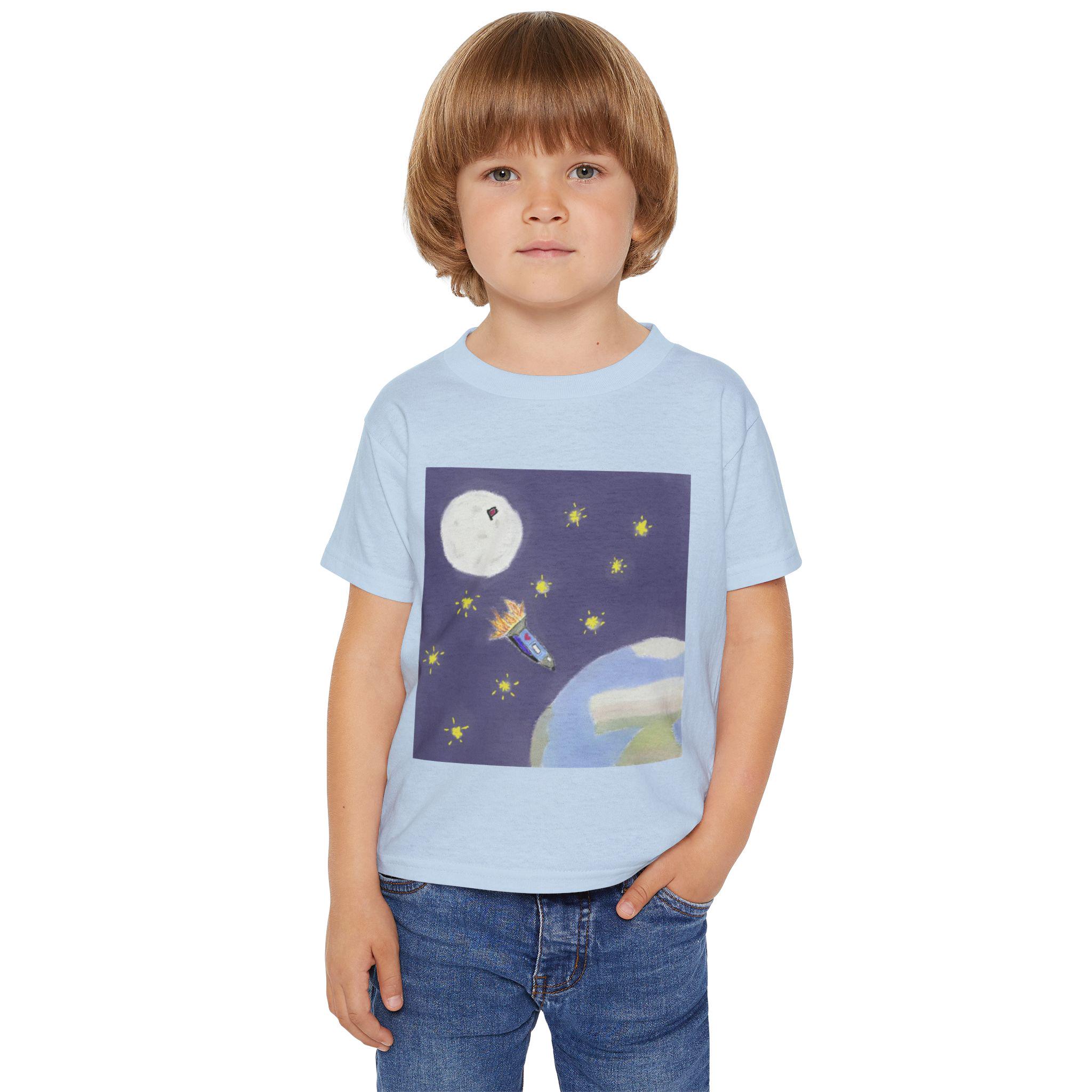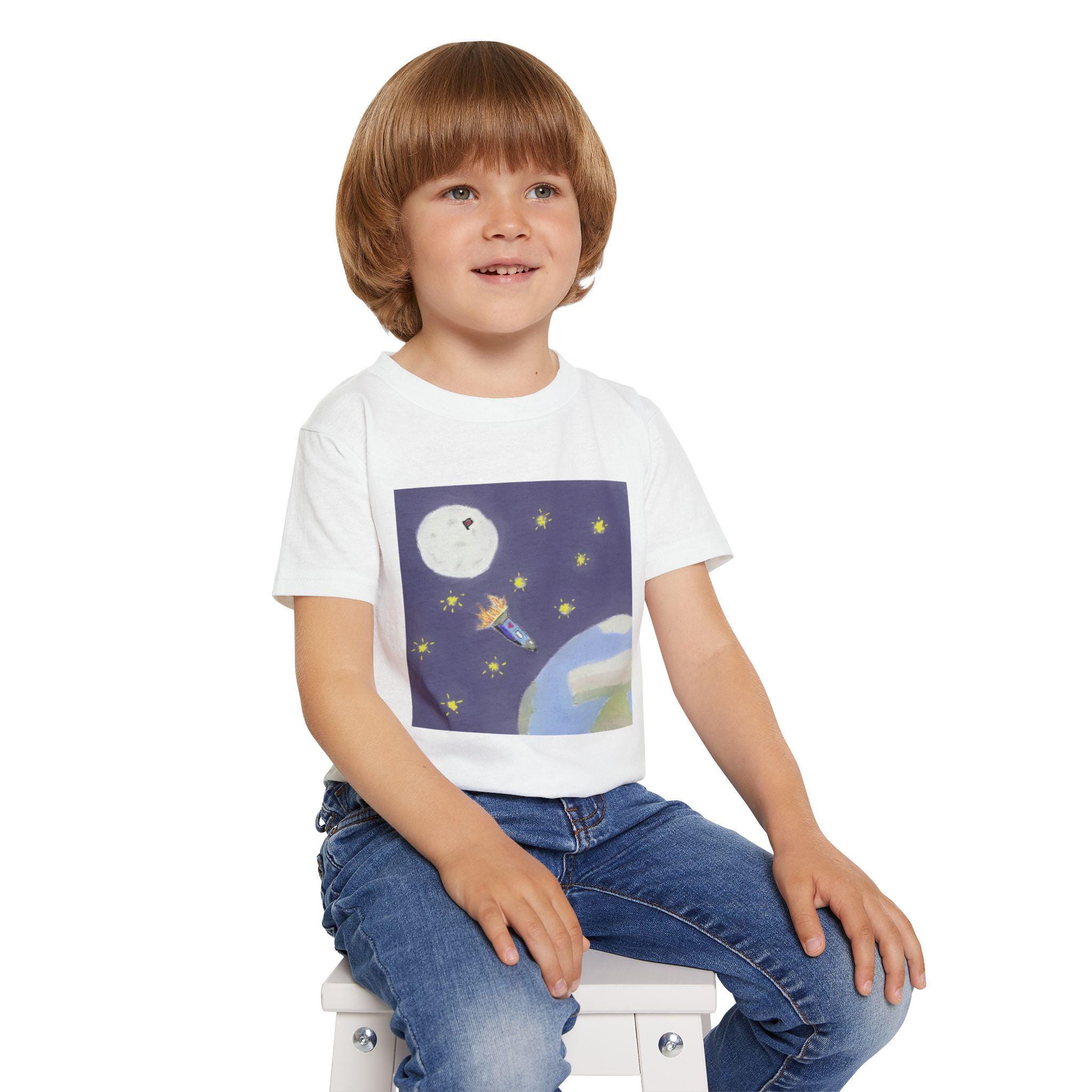 A cozy toddler tee that brings bedtime wonder into everyday play. Soft, medium-weight cotton holds a hand-painted space scene—Earth, a smiling moon, scattering stars and a bright rocket—so little imaginations can launch right from the playroom. The classic fit and ribbed collar make dressing easy; the twill-taped neck and side seams keep the shape through crawls, climbs, and repeated washes. Lightweight enough for layering under a hoodie, and comfortable for quiet story time under star-shaped nightlights.