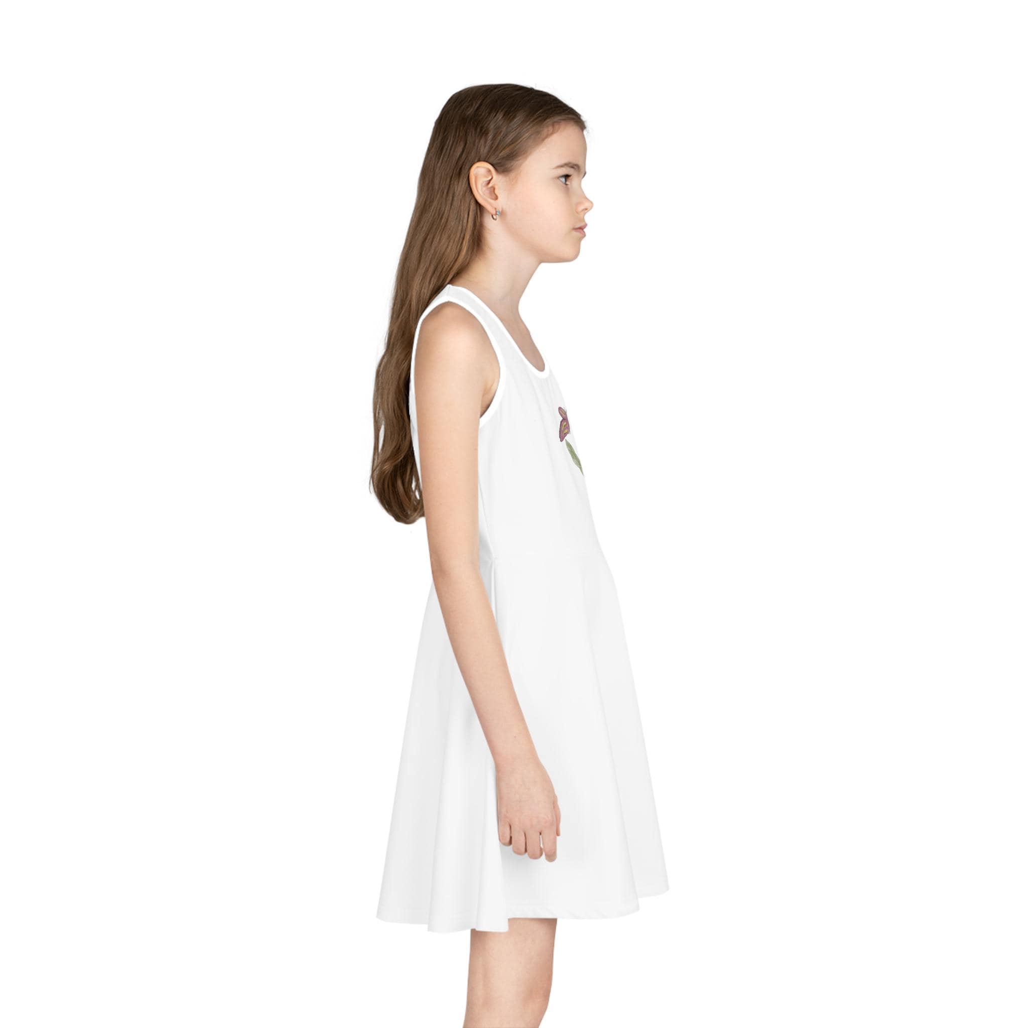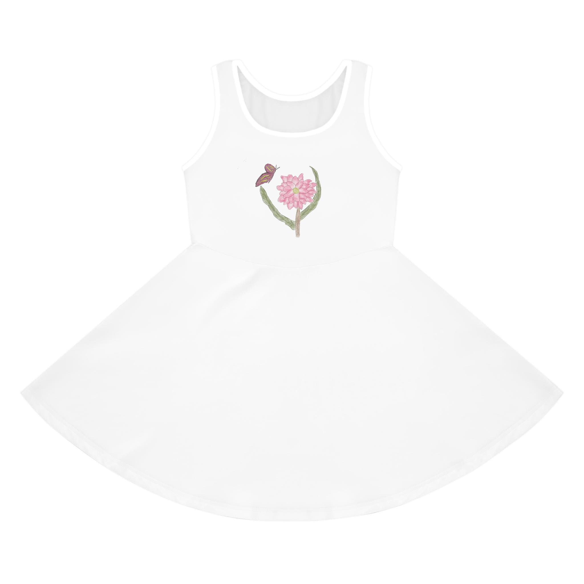 Light as a summer breeze and sprinkled with gentle charm — this sleeveless midi dress brings a hand-stitched floral moment to everyday play. The soft, slightly stretchy knit drapes into a swishy A-line silhouette that moves when she runs, twirls, or pauses to pick a wildflower. A delicate pink blossom and tiny butterfly sit near the chest like a secret brooch, adding wistful, nature-driven detail without fuss. It layers easily over sun hats and sandals for warm afternoons, and pairs with cardigans when the evening cools. Thoughtful finishes — a round neckline, double-stitched hems, and a comfortable mid-length — make it a calm, durable choice for days full of motion and wonder.