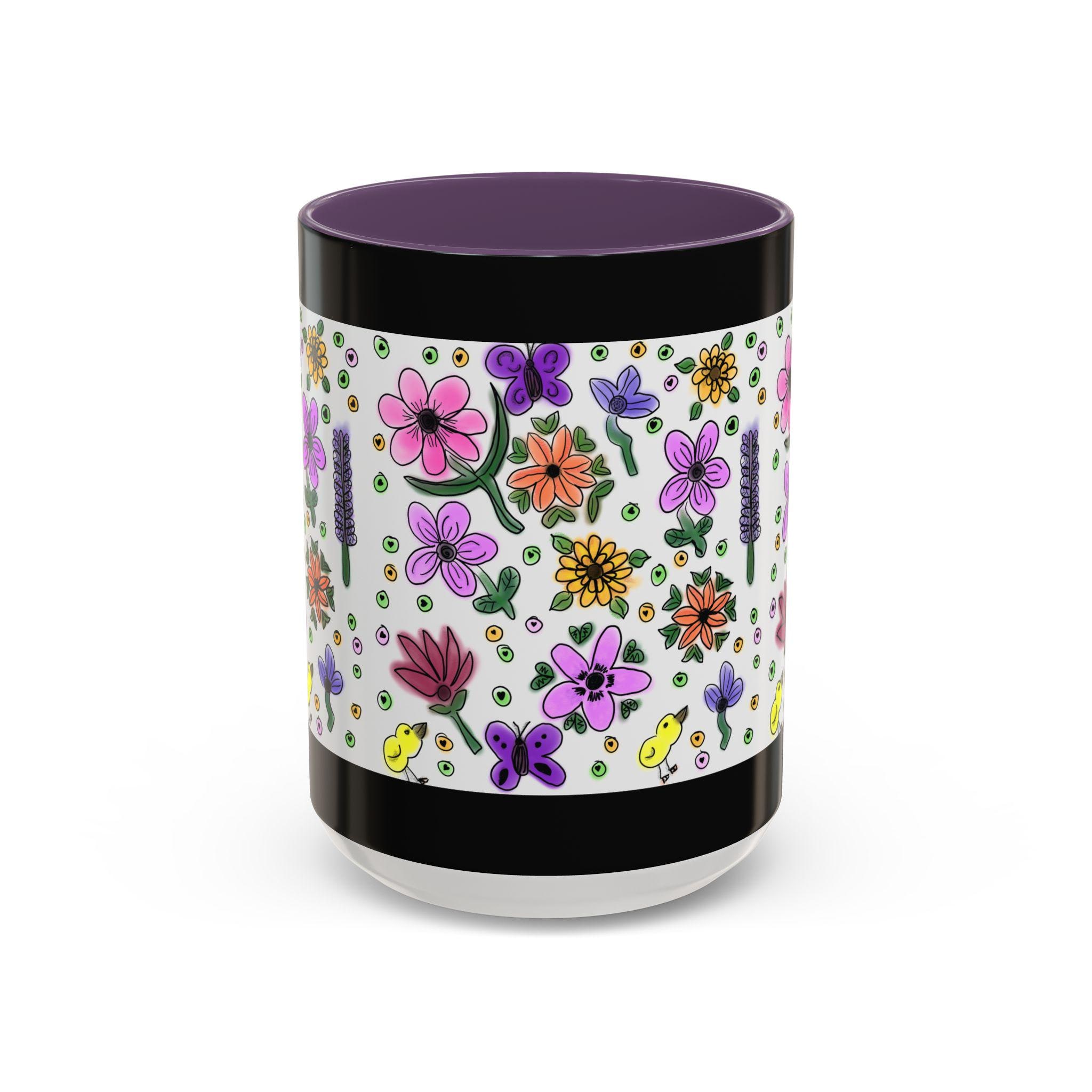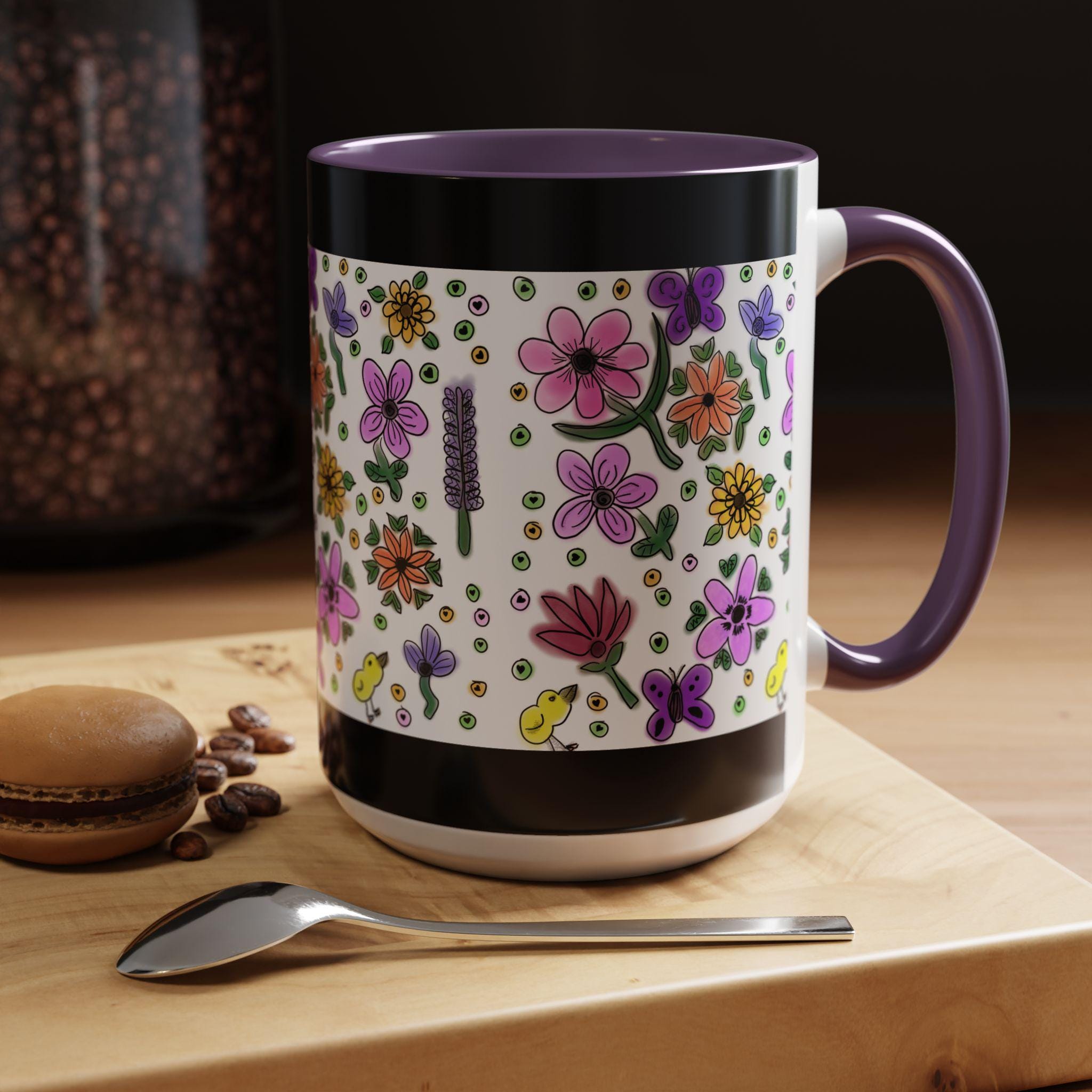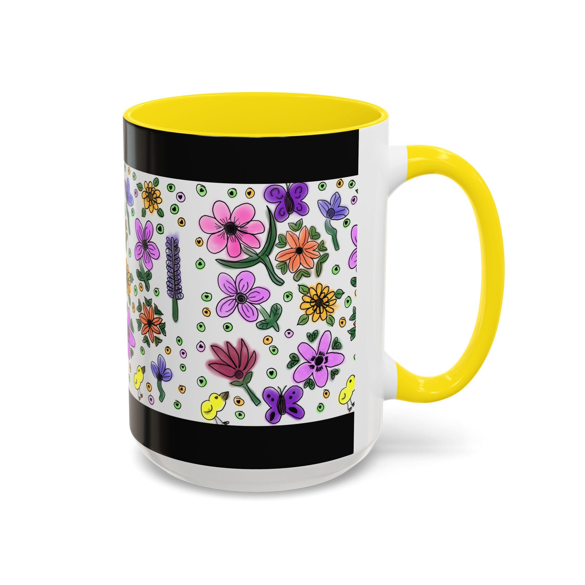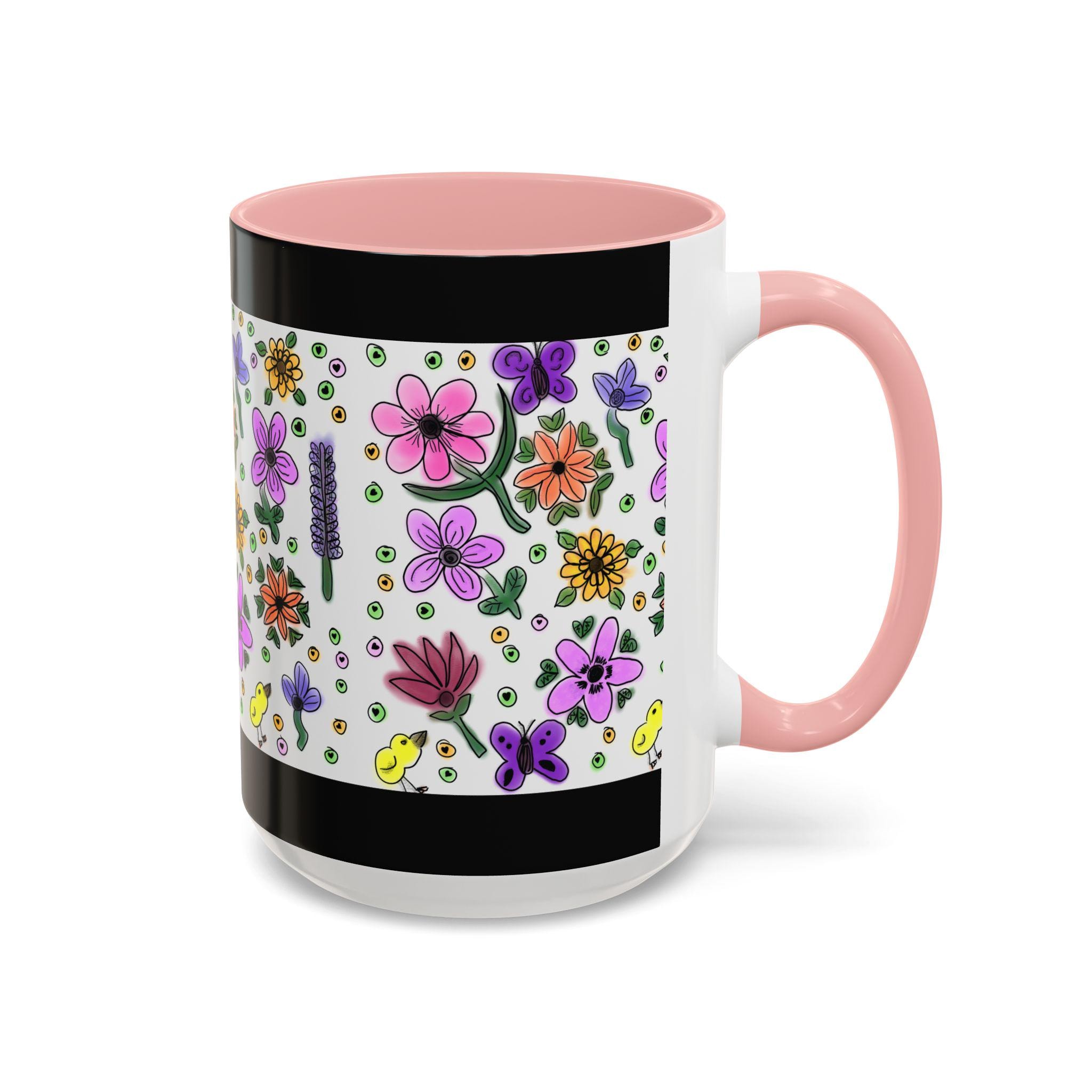 Bright, hand-drawn florals bloom across a glossy ceramic mug, framed by a bold black rim and a pink, purple, yellow, or orange interior and handle. Each sip feels like a quiet morning in a sunlit garden — cheerful petals, tiny buds, cute chicks, and playful dots wrap around the cup to bring color and calm to your daily routine. Lightweight enough for a cozy desk, this mug pairs lively illustration with everyday durability. It holds a generous pour, resists fading, and cleans easily, so your favorite brew stays front-and-center without fuss.