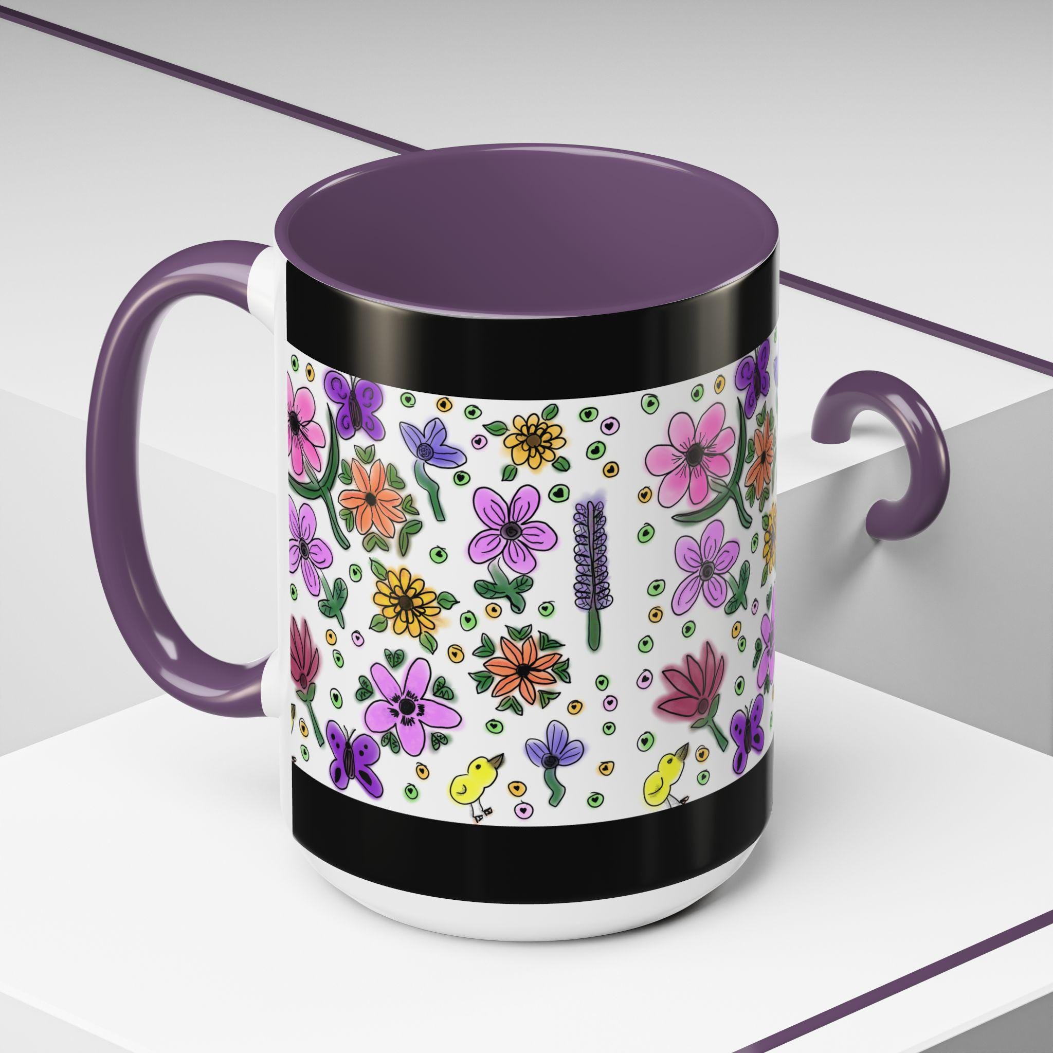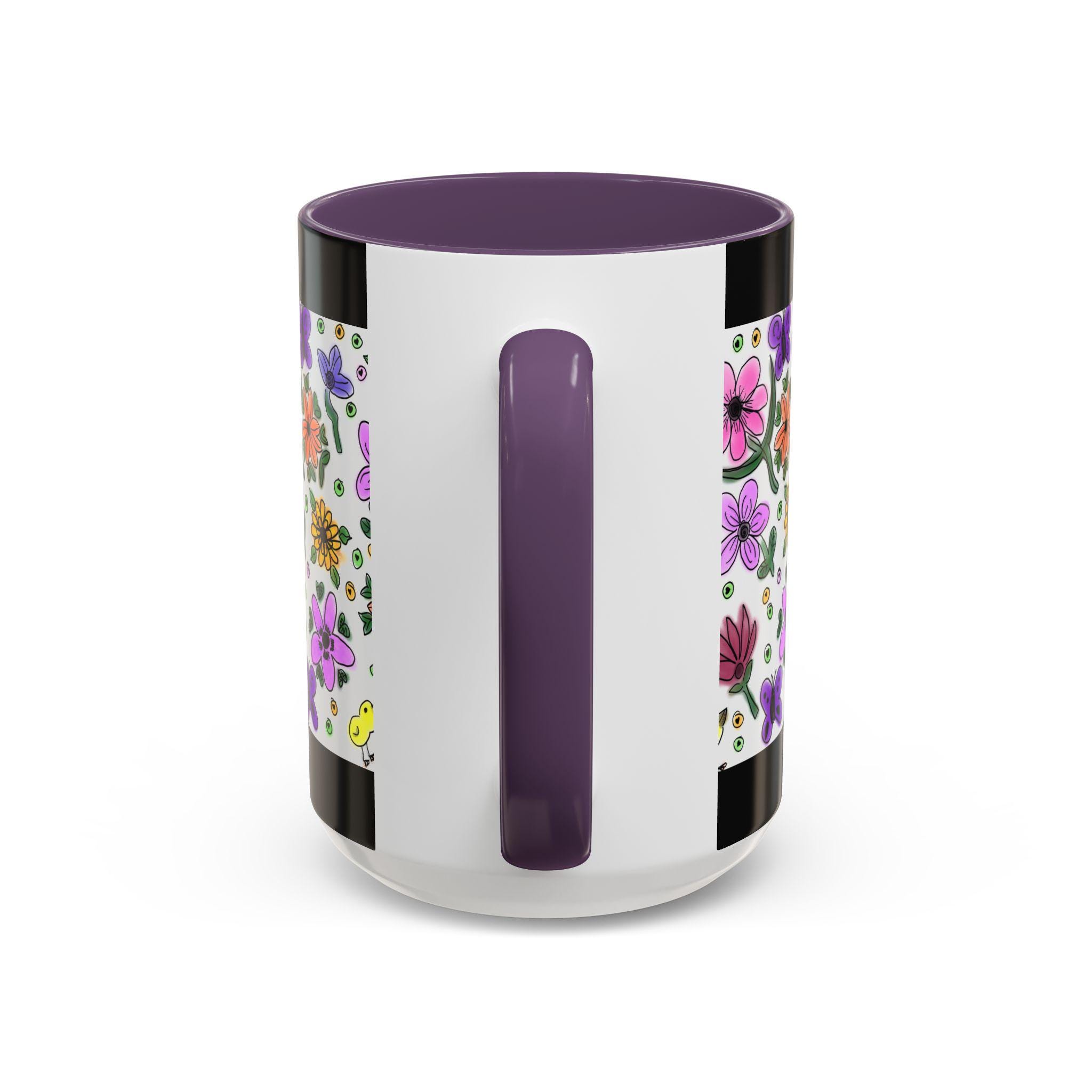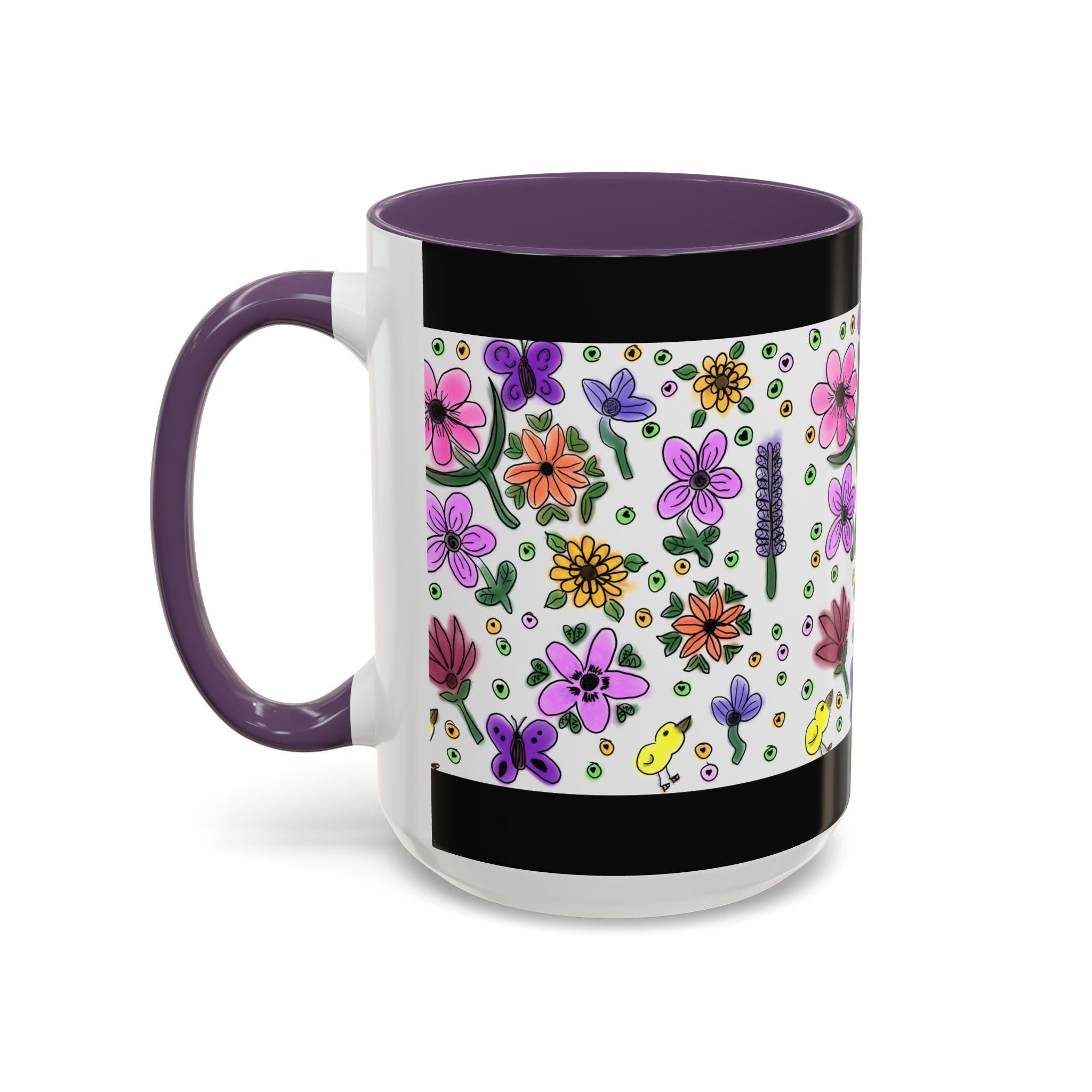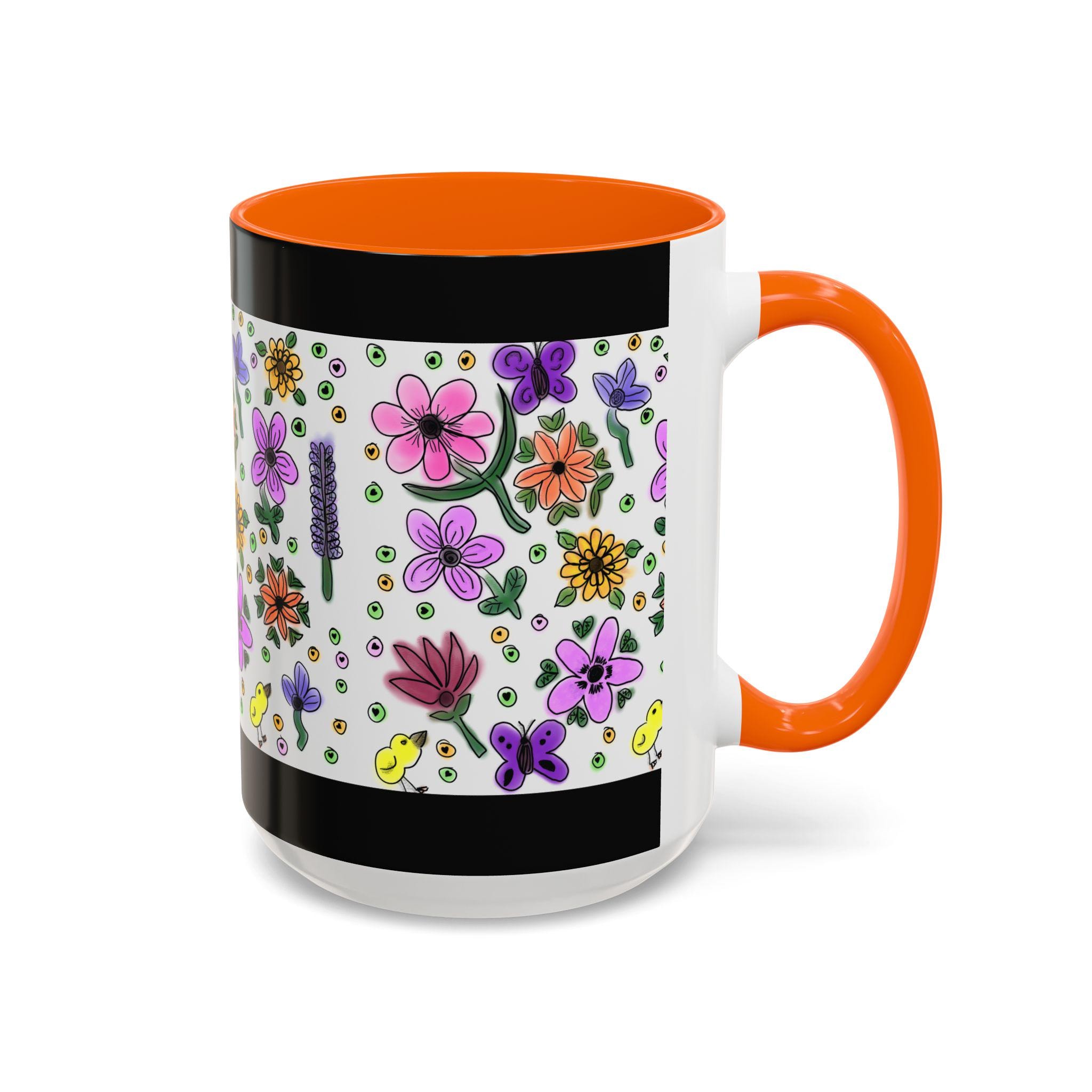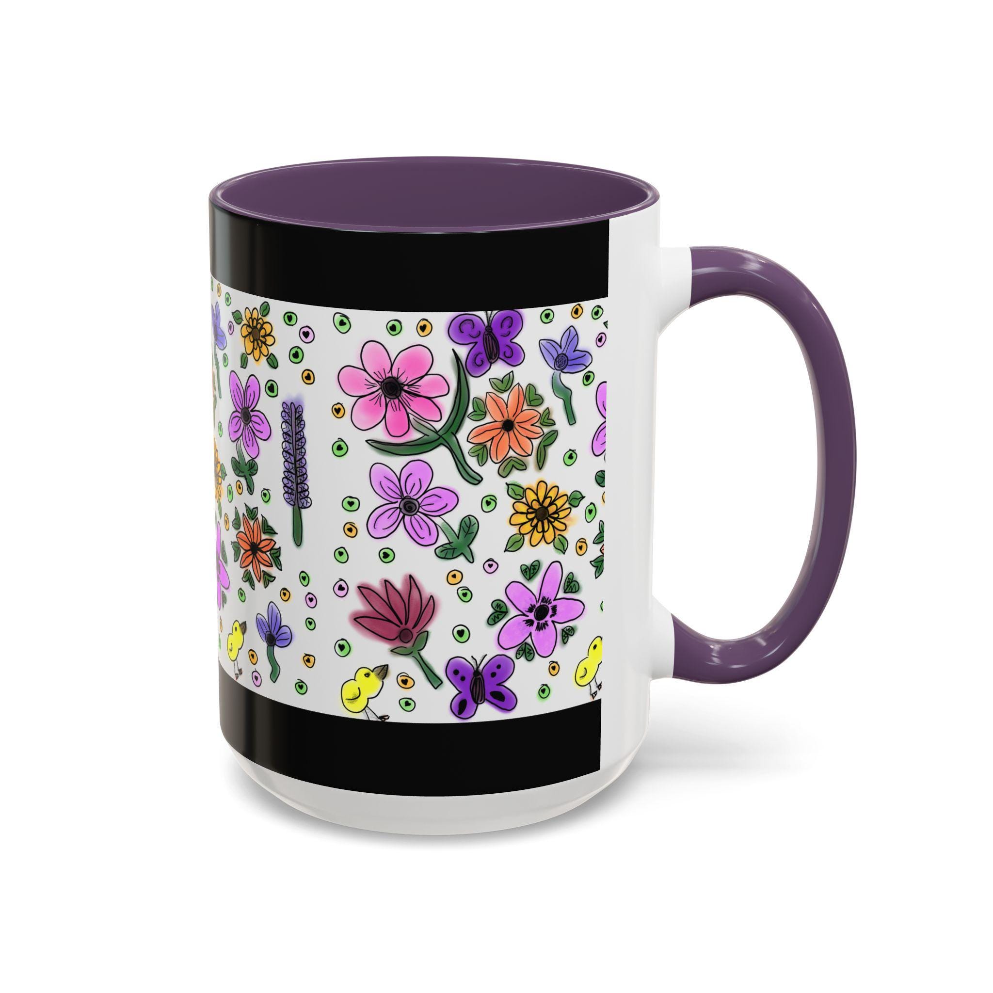 Bright, hand-drawn florals bloom across a glossy ceramic mug, framed by a bold black rim and a pink, purple, yellow, or orange interior and handle. Each sip feels like a quiet morning in a sunlit garden — cheerful petals, tiny buds, cute chicks, and playful dots wrap around the cup to bring color and calm to your daily routine. Lightweight enough for a cozy desk, this mug pairs lively illustration with everyday durability. It holds a generous pour, resists fading, and cleans easily, so your favorite brew stays front-and-center without fuss.