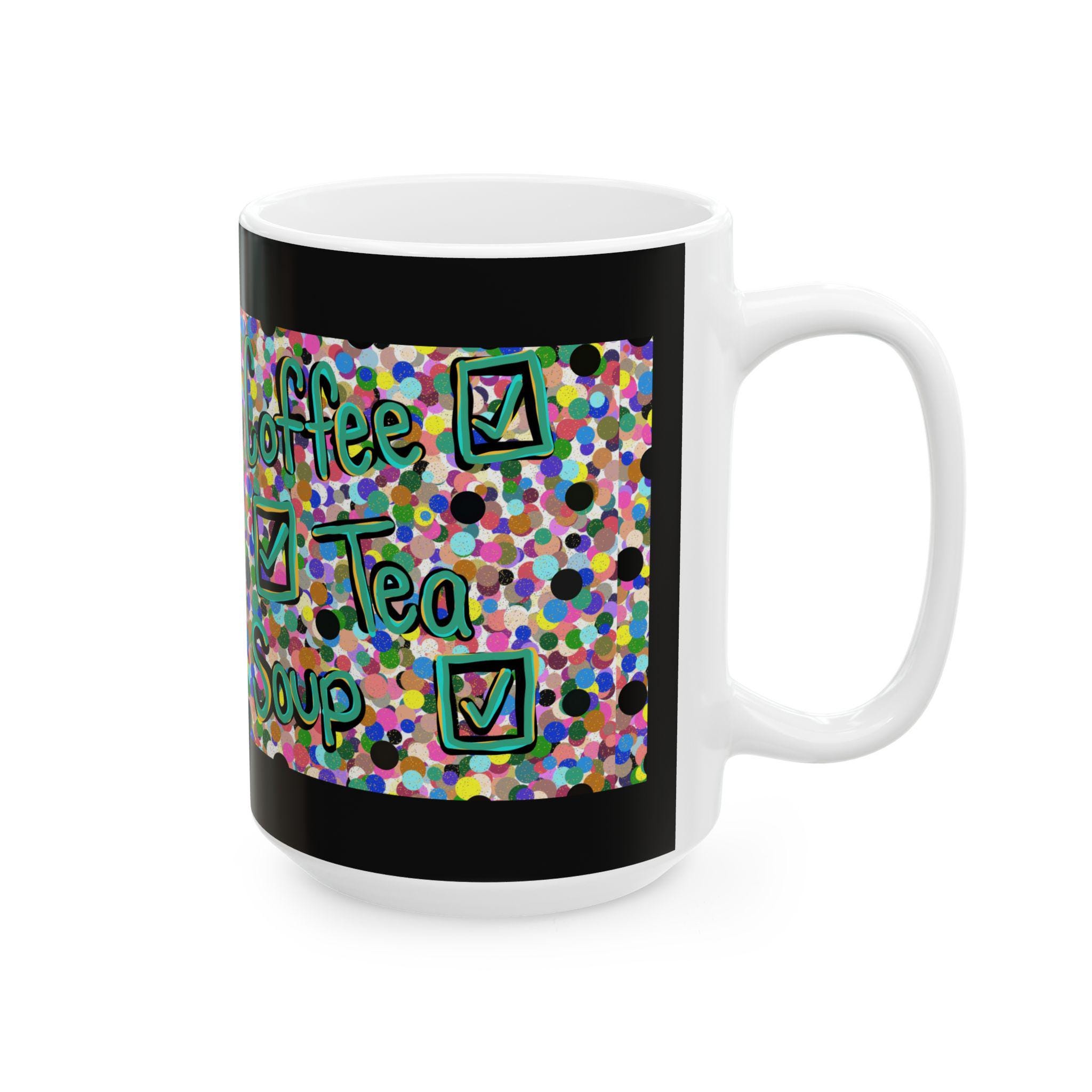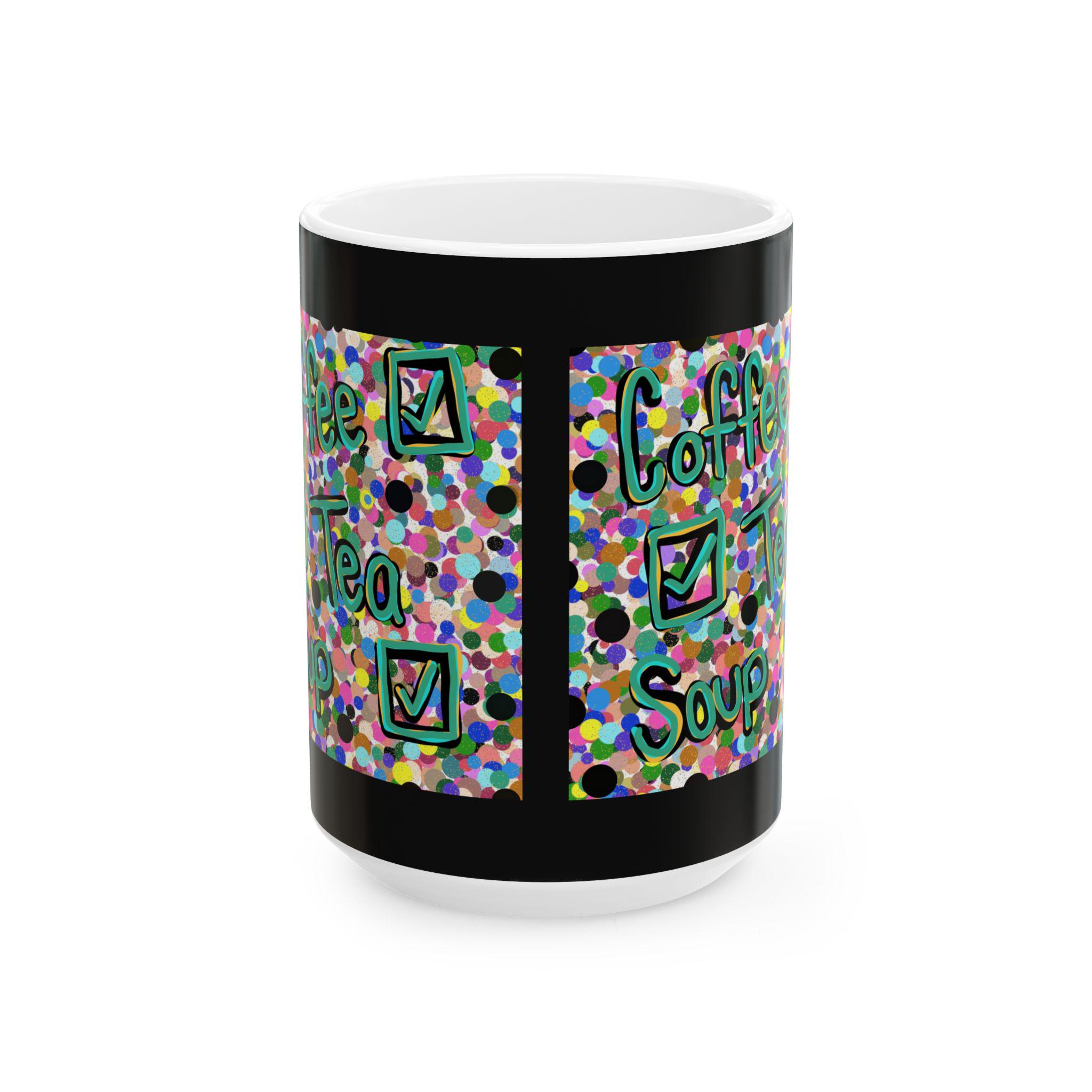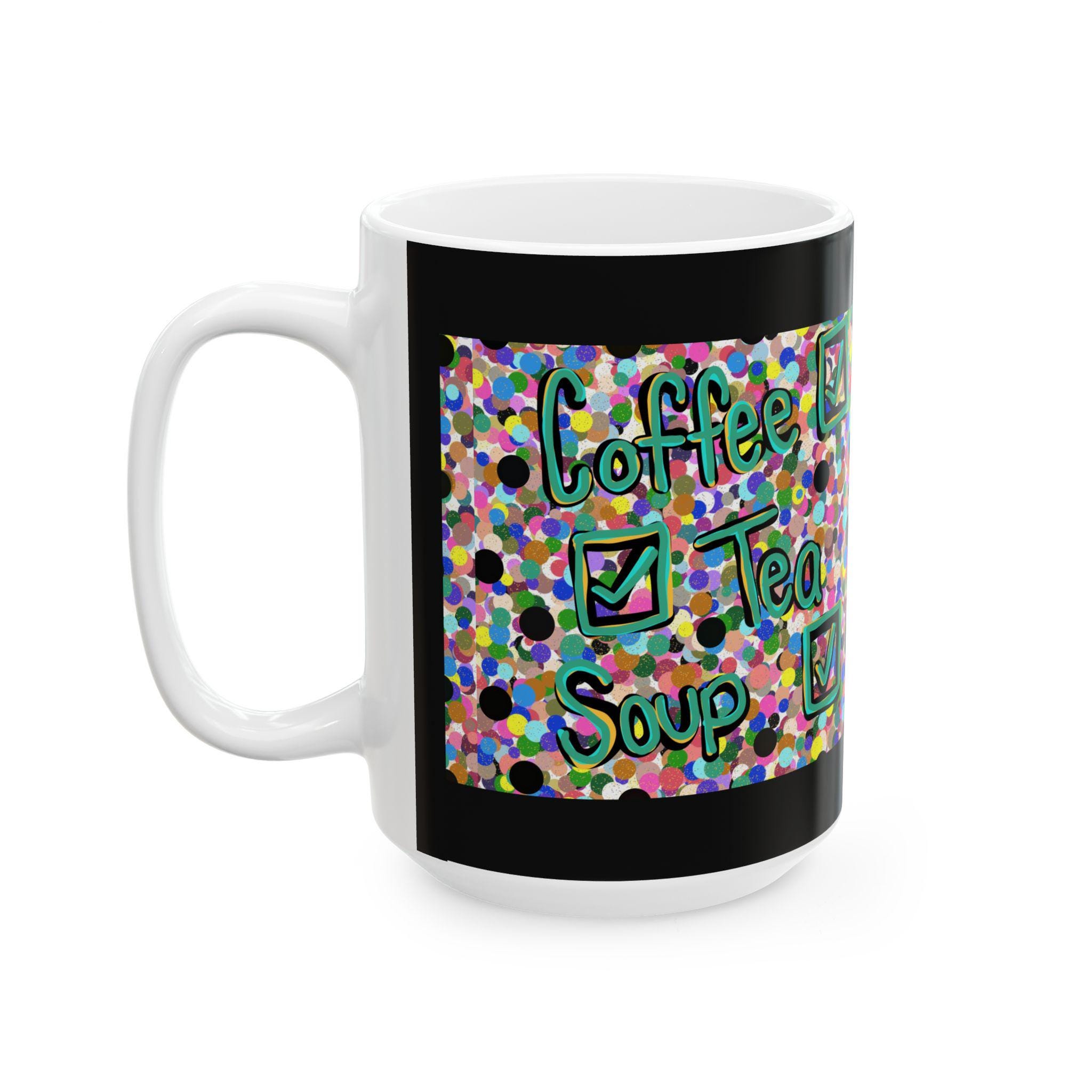 Bright, playful ceramic mug that turns morning rituals into a moment of joy. A confetti-like background of colorful dots wraps around the mug, framed by bold black panels that make the hand-drawn checklist-style text pop. Each checkbox and word—Coffee, Tea, Soup—feels like a friendly reminder to slow down and savor a warm sip. Lightweight enough for everyday use, the glossy finish makes the colors sing while the comfortable C-handle keeps it easy to hold. This is for people who love cheerful, artsy designs that bring personality to their kitchen and desk.