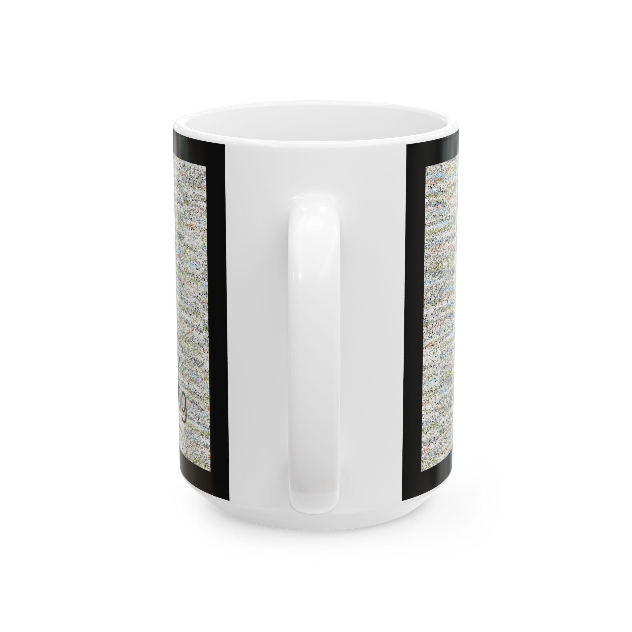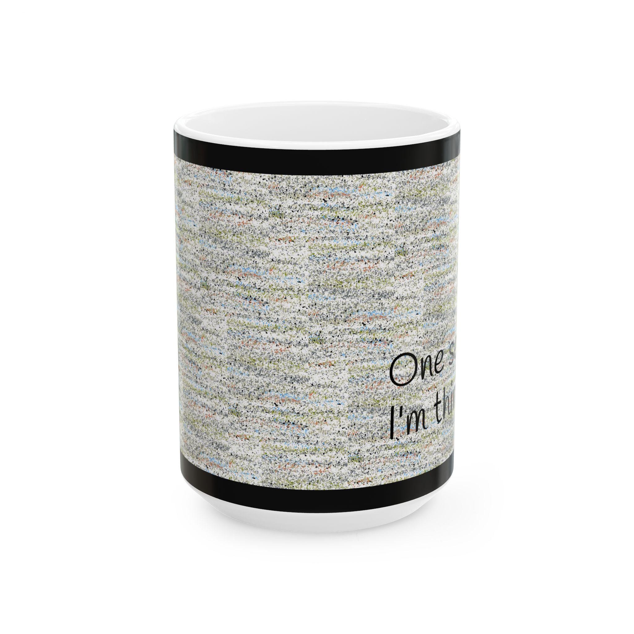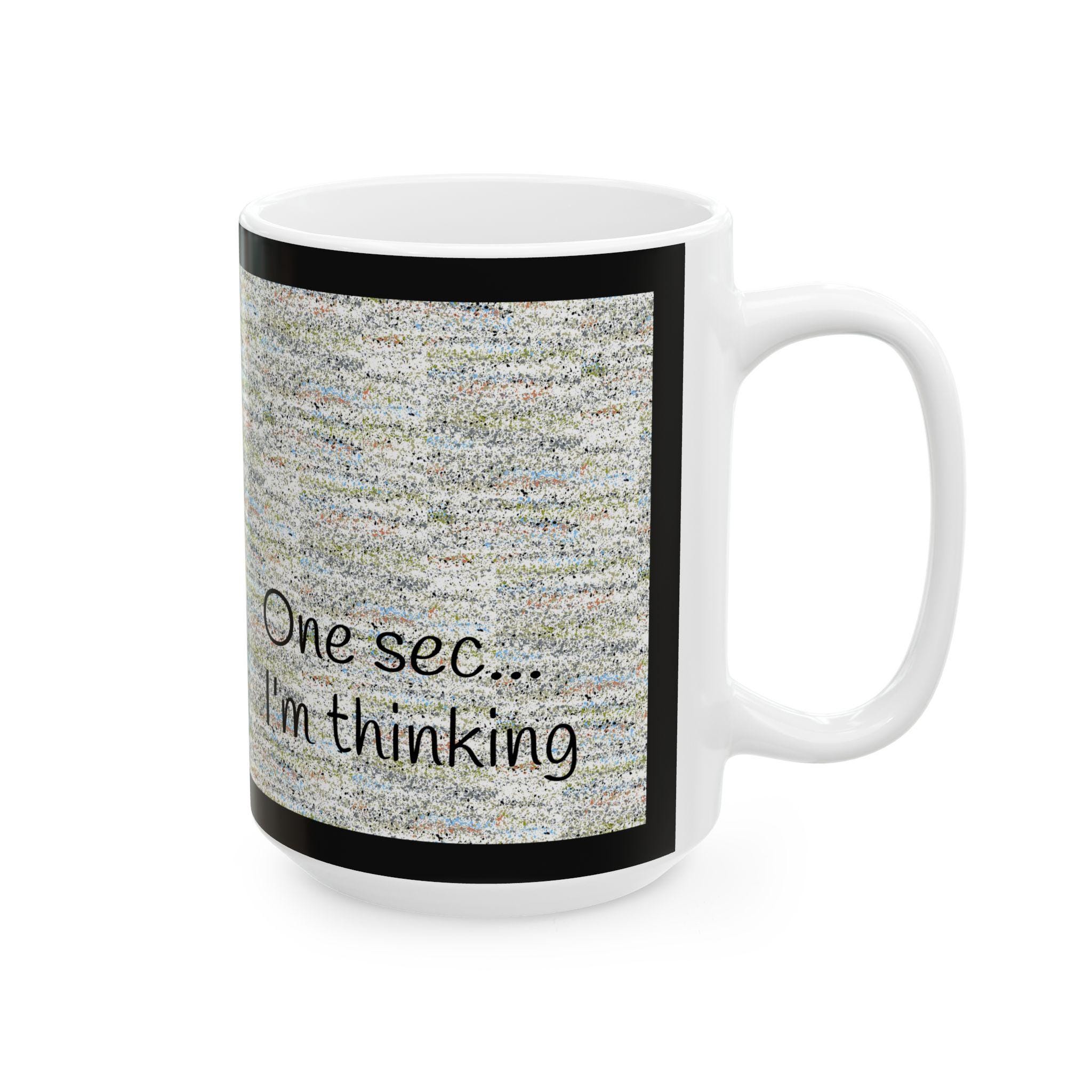 A glossy ceramic mug that speaks for those quiet, slightly distracted moments. The soft, textured background wraps around the cup, punctuated by the simple handwritten line: “One sec... I’m thinking.” It feels like a gentle pause between sips — a small, relatable reminder to breathe, muse, and find focus. The clean black border and readable script make the message clear without shouting. Use it at your desk, on the sofa, or beside a notebook while planning the next move. It blends everyday function with a wink of personality, turning an ordinary coffee break into a tiny ritual.
