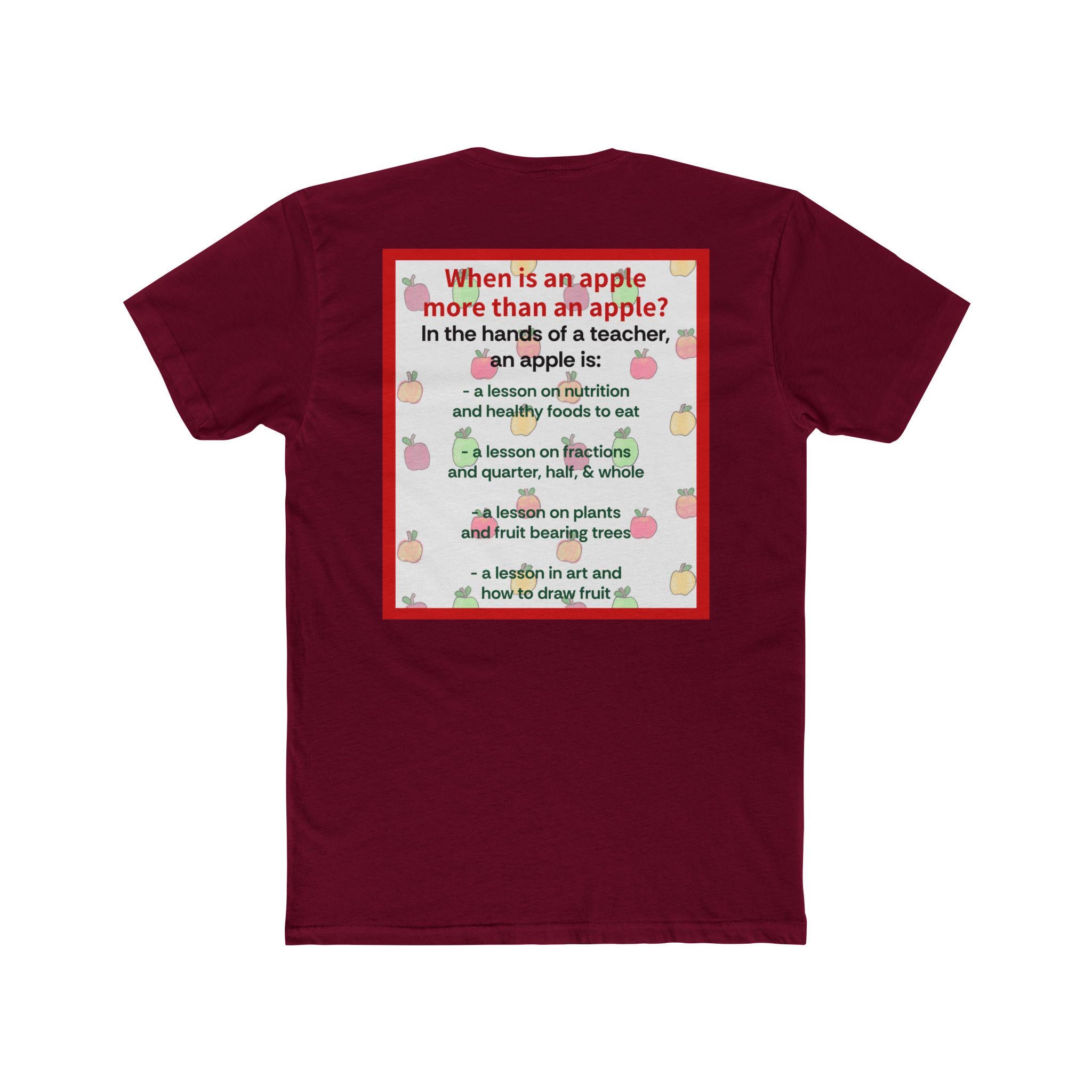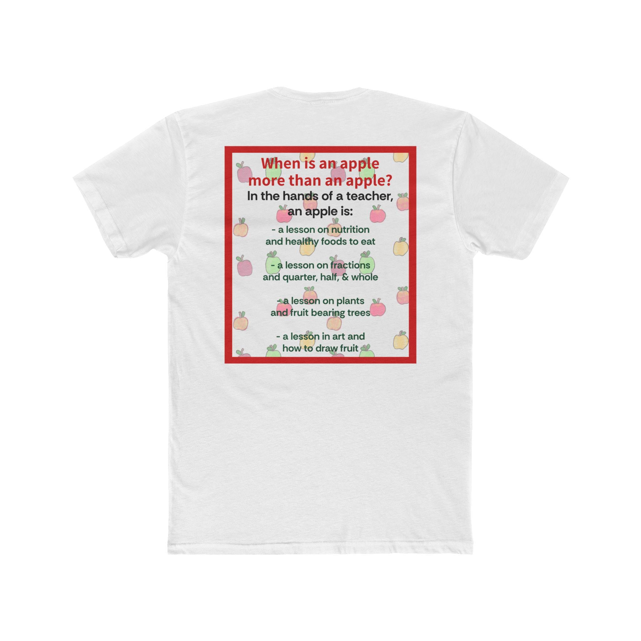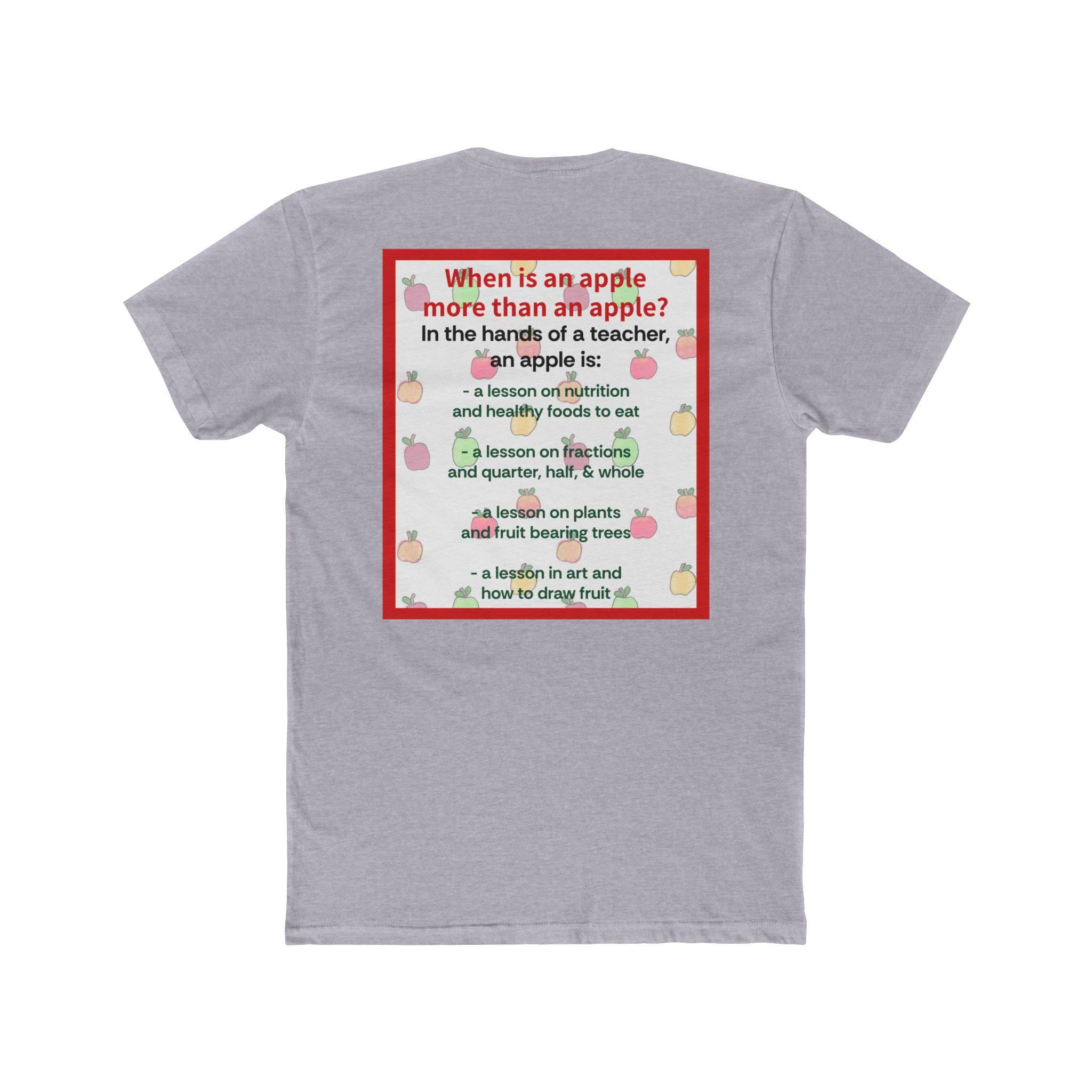 This lightweight cotton crew tee brings a warm, playful nod to teachers and classroom life. Soft-feeling fabric and a classic crew neckline make it easy to wear from morning carpool to after-school meetings. A small, sweet apple graphic sits on the chest while a larger, colorful text-and-apple design covers the back with a thoughtful, lesson-themed message — a little reminder of the impact a teacher has, told through apple imagery and friendly type. The fit is timeless and clean, so the shirt layers well under cardigans, pairs with jeans or chinos, and stays comfortable during long school days. Subtle ribbed collar and shoulder tape keep the tee shaped wash after wash, and the Direct-to-Film sleeve print adds crisp, lasting detail.