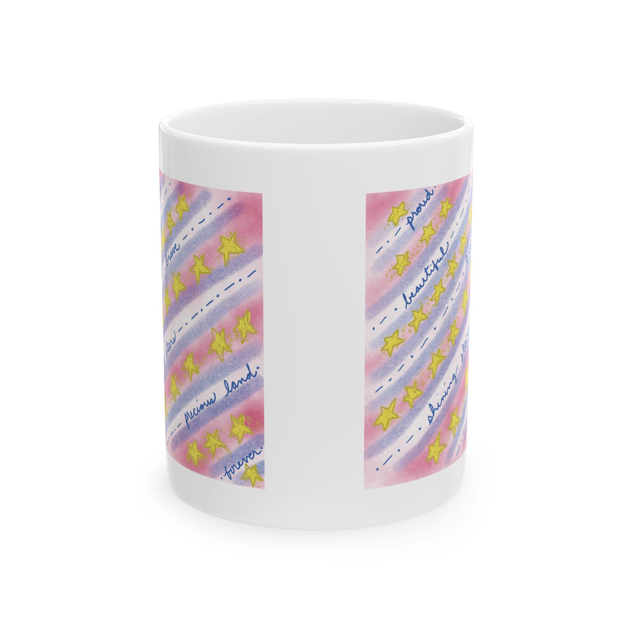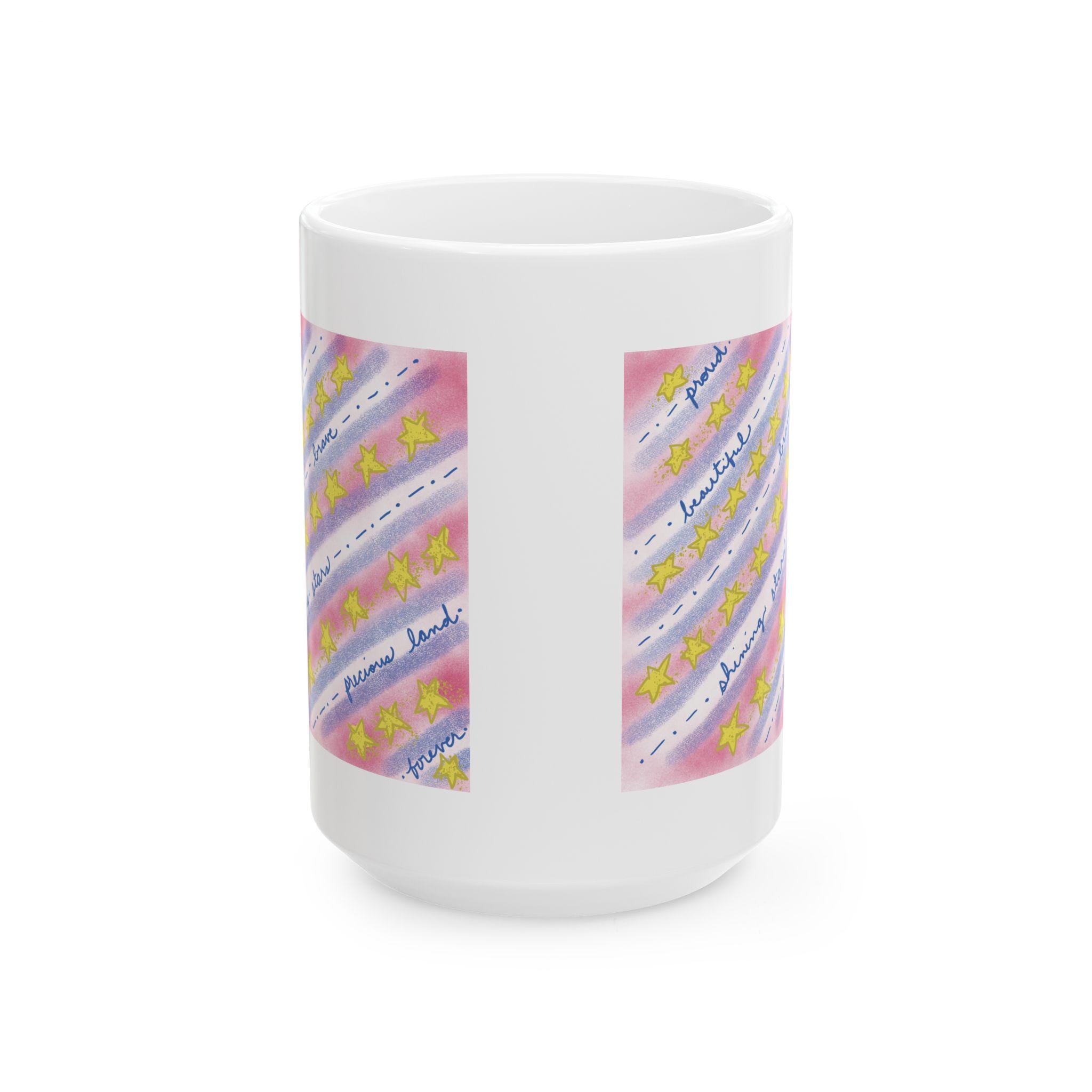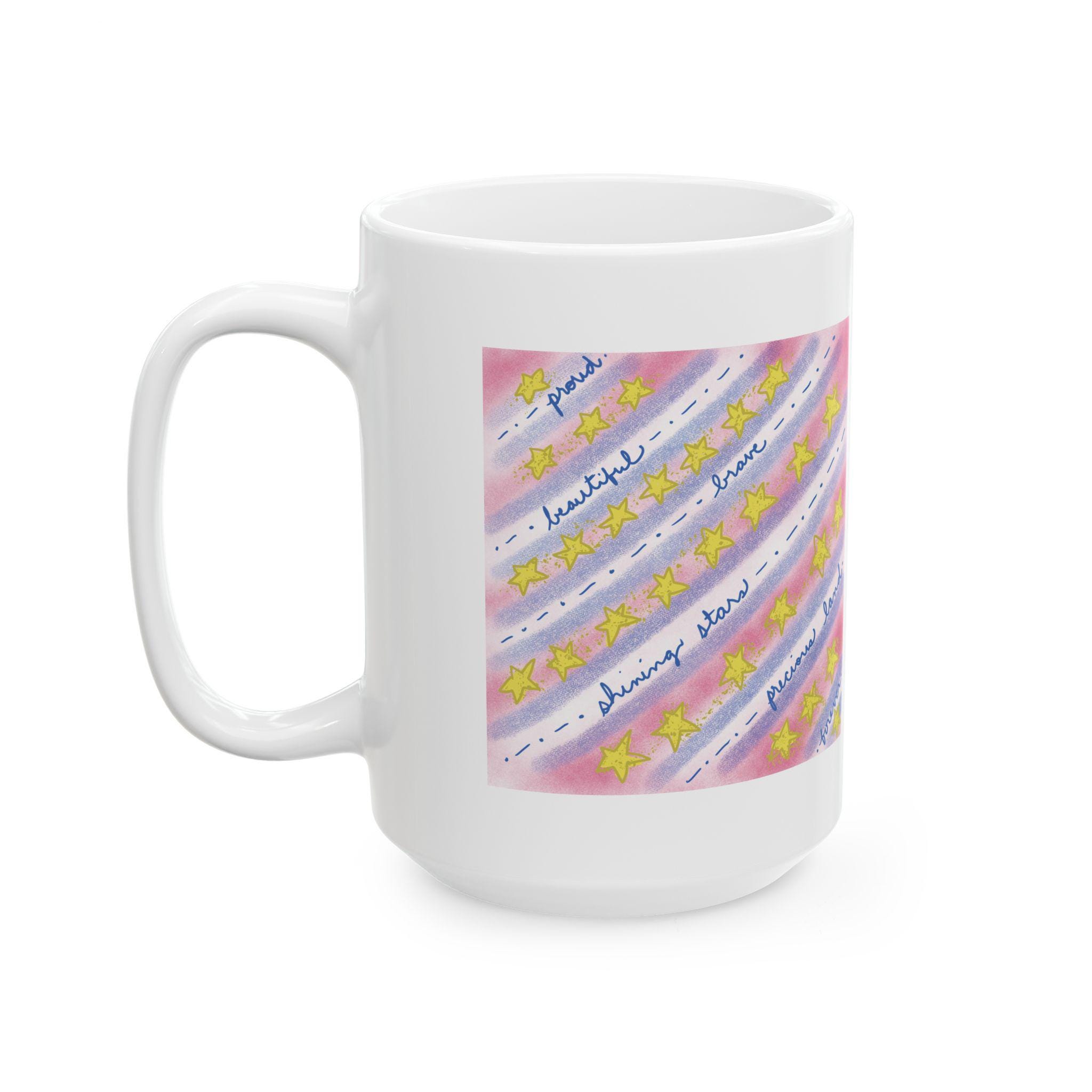 Sip from a little piece of hand-painted warmth. This glossy ceramic mug carries soft watercolor washes of pink and blue, scattered golden stars, and patriotic words expressing country love. The glow of the colors brightens a slow morning and the gentle design makes ordinary coffee or tea feel quietly celebratory. Hold the comfortable C-handle and notice the cheerful shimmer of the print — it reads like a thoughtful note left on the counter, ready to anchor a calm start or steady a late-night work session.